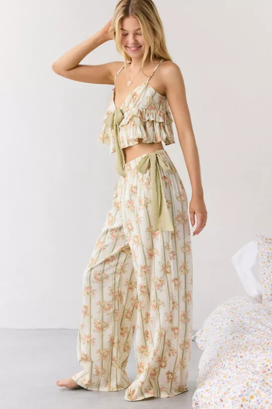 Urban Outfitters Out From Under Sweet Nothings Tie-Front Bow Babydoll Tank Top, $35, available here and PJ Pants, $49, available here