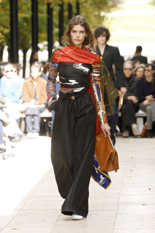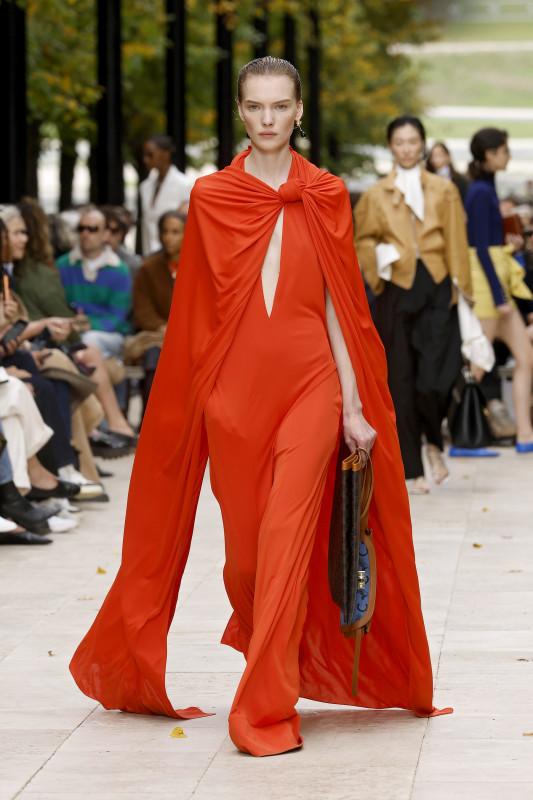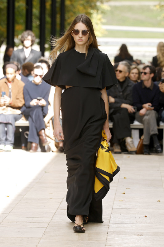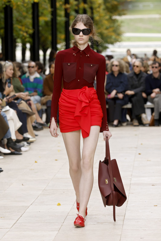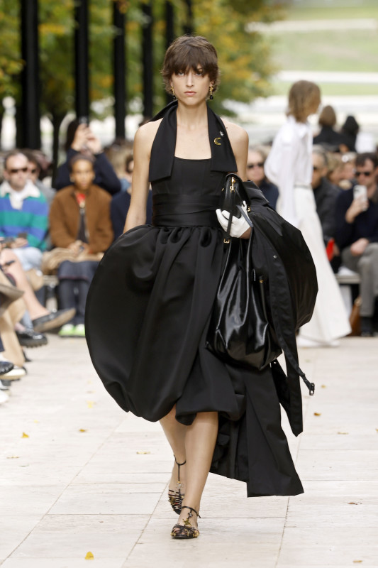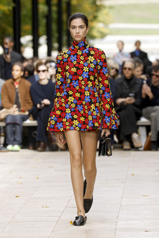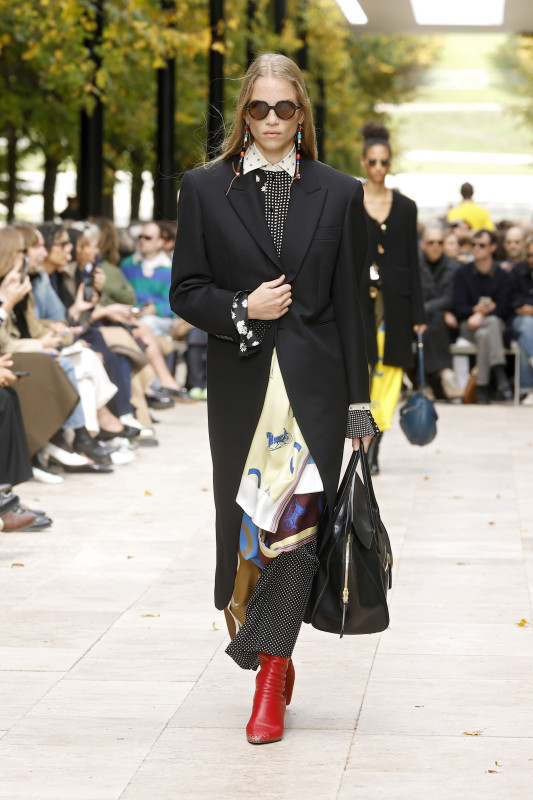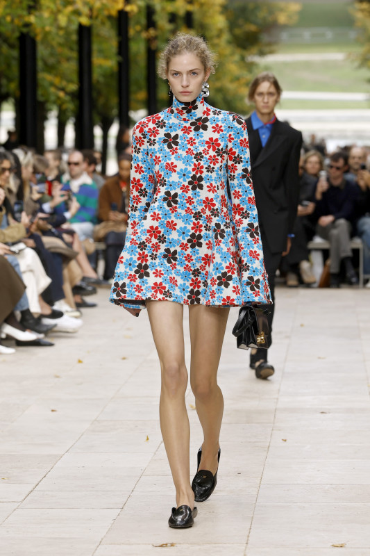 “We were thinking about good times, about lightness and about summer heat,” Rider shared in the show notes. This lightness is exemplified in the collection’s flared mini dresses, as well as vibrant patterned scarves, cherry red accessories and flowing maxi dresses.