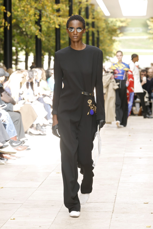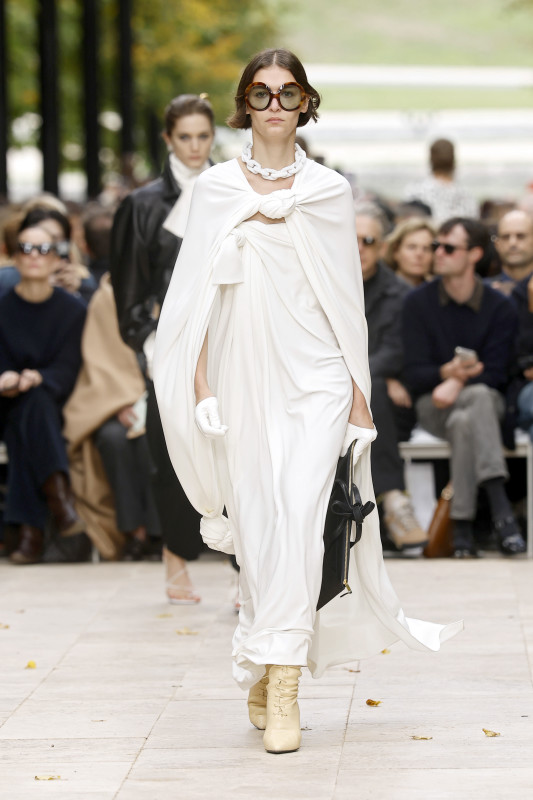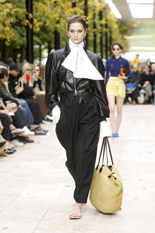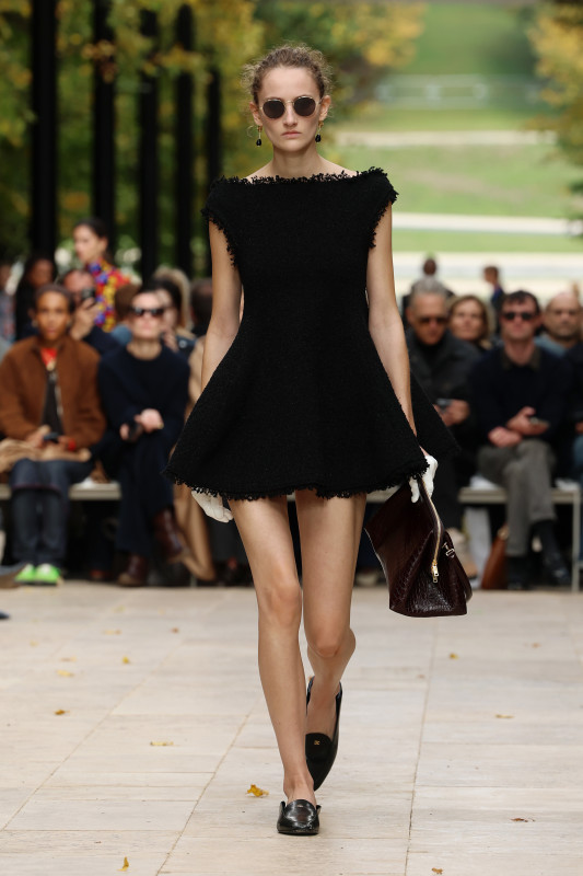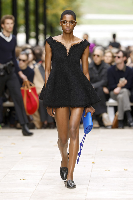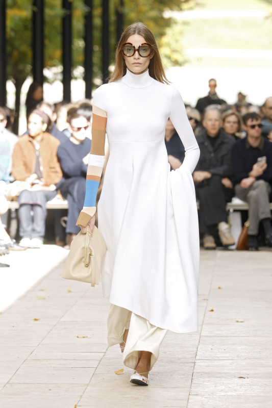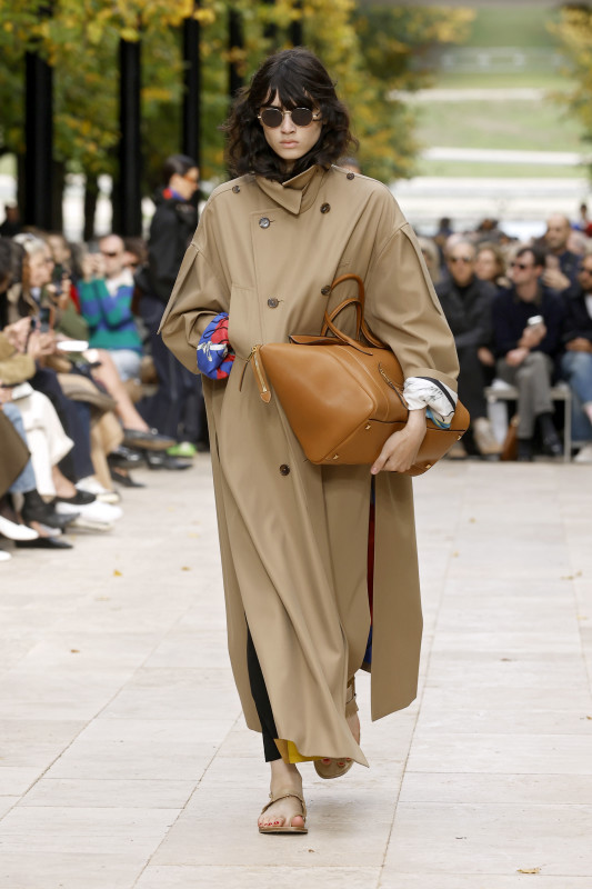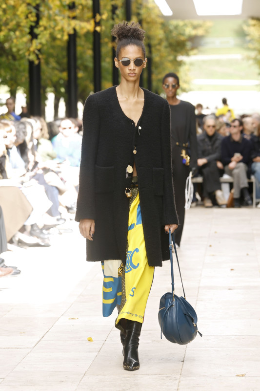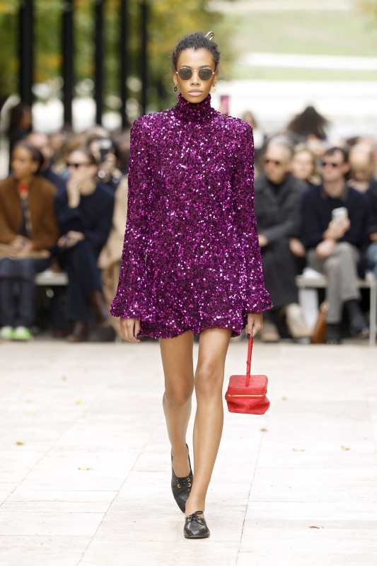 “We were thinking about good times, about lightness and about summer heat,” Rider shared in the show notes. This lightness is exemplified in the collection’s flared mini dresses, as well as vibrant patterned scarves, cherry red accessories and flowing maxi dresses.