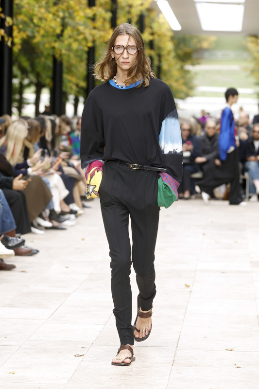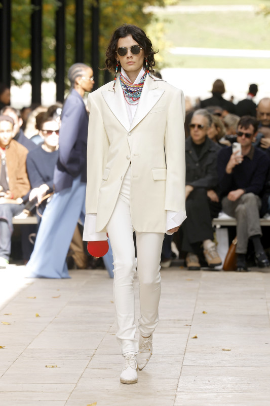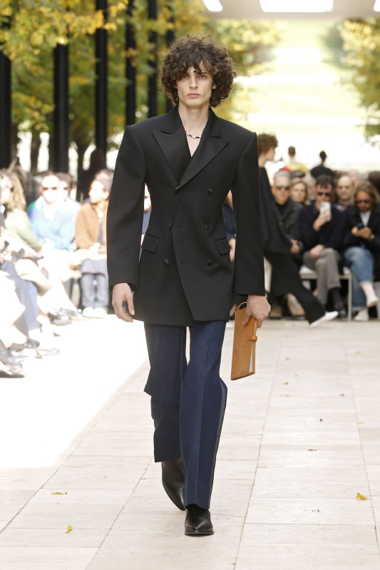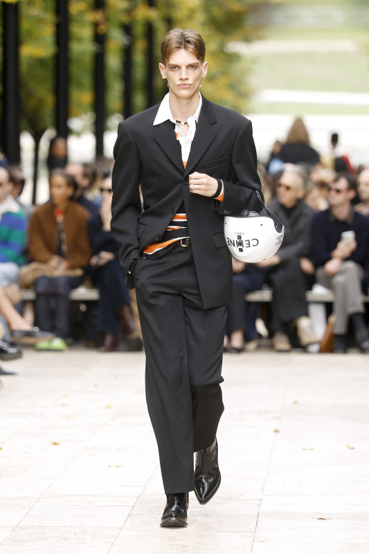 Rider played with “the tension between discretion and showing skin,” resulting in a masterclass of thoughtful draping and layering. Celine’s sharply-tailored blazers stand out as a key co-ed styling piece, rendered with strong shoulders and double-breasted detailing.