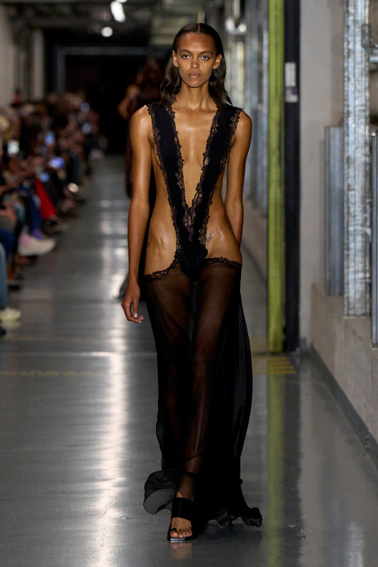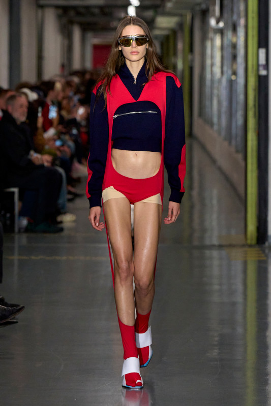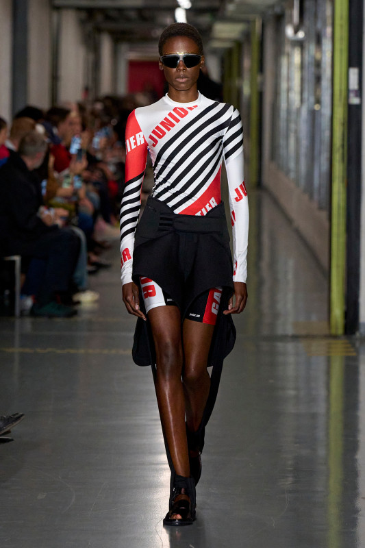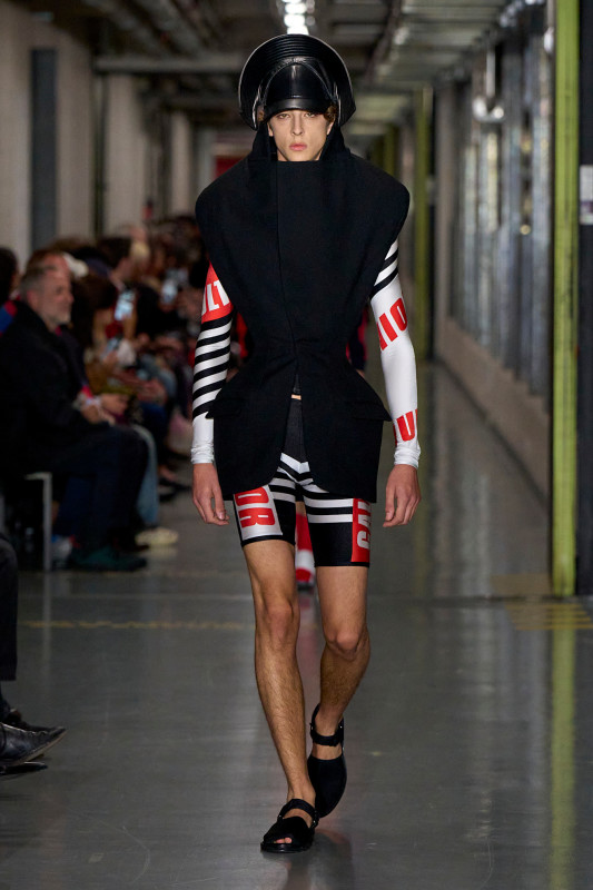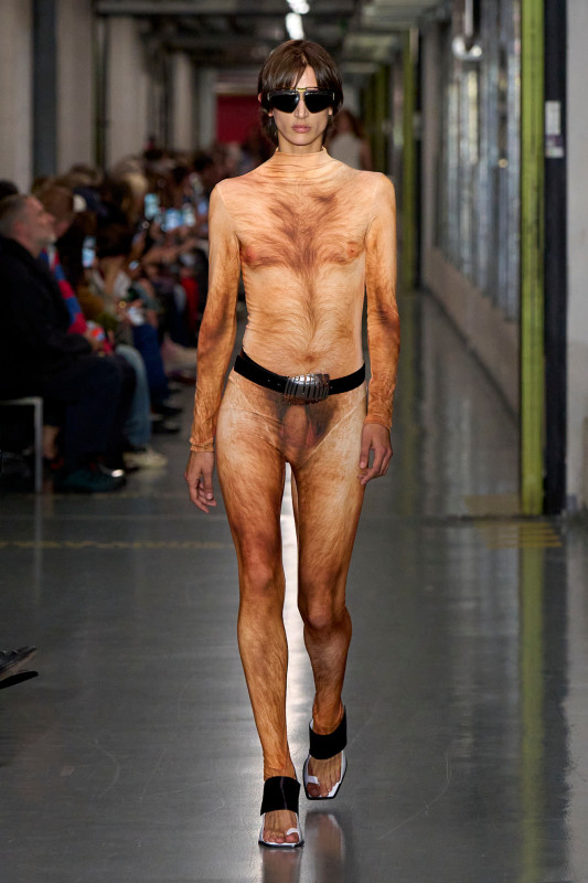 The Dutch designer melded classic Jean Paul Gaultier codes (think nautical stripes and tattooed designs) with his established penchant for the avant-garde and subversive (bulbous silhouettes, risqué cutouts and pantsless looks). Perhaps the most striking (read: internet-breaking) designs were Lantink’s full-body catsuits baring a particularly hairy nude man’s crown jewels. A furry nipple-printed bra and skirt ensemble followed closely behind.